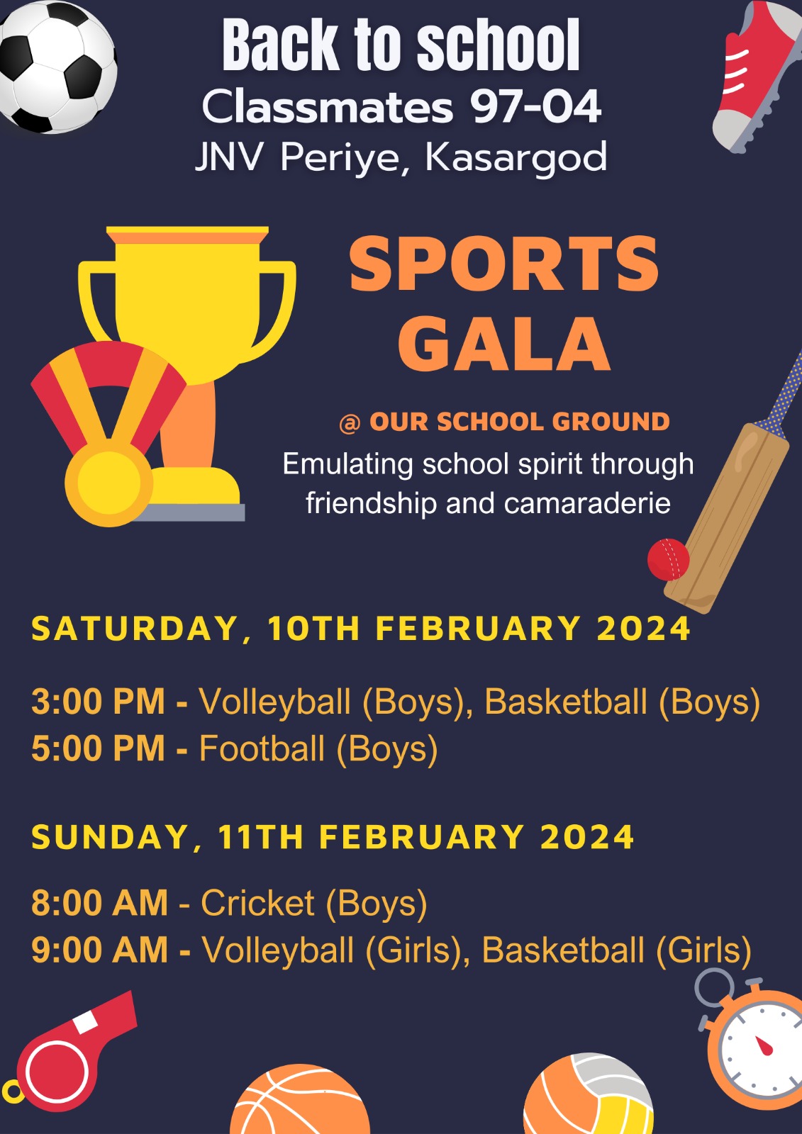 Under banner Back to school the 12th batch of JNV kasaragod (97-04) organising a full day sports event at Vidyalaya ground morning 8:00 AM Cricket (Boys) 9:00 AM Volley Ball (Boys & Girls) 4:00 PM Football (Boys) 5:00 PM BasketBall (Girls)