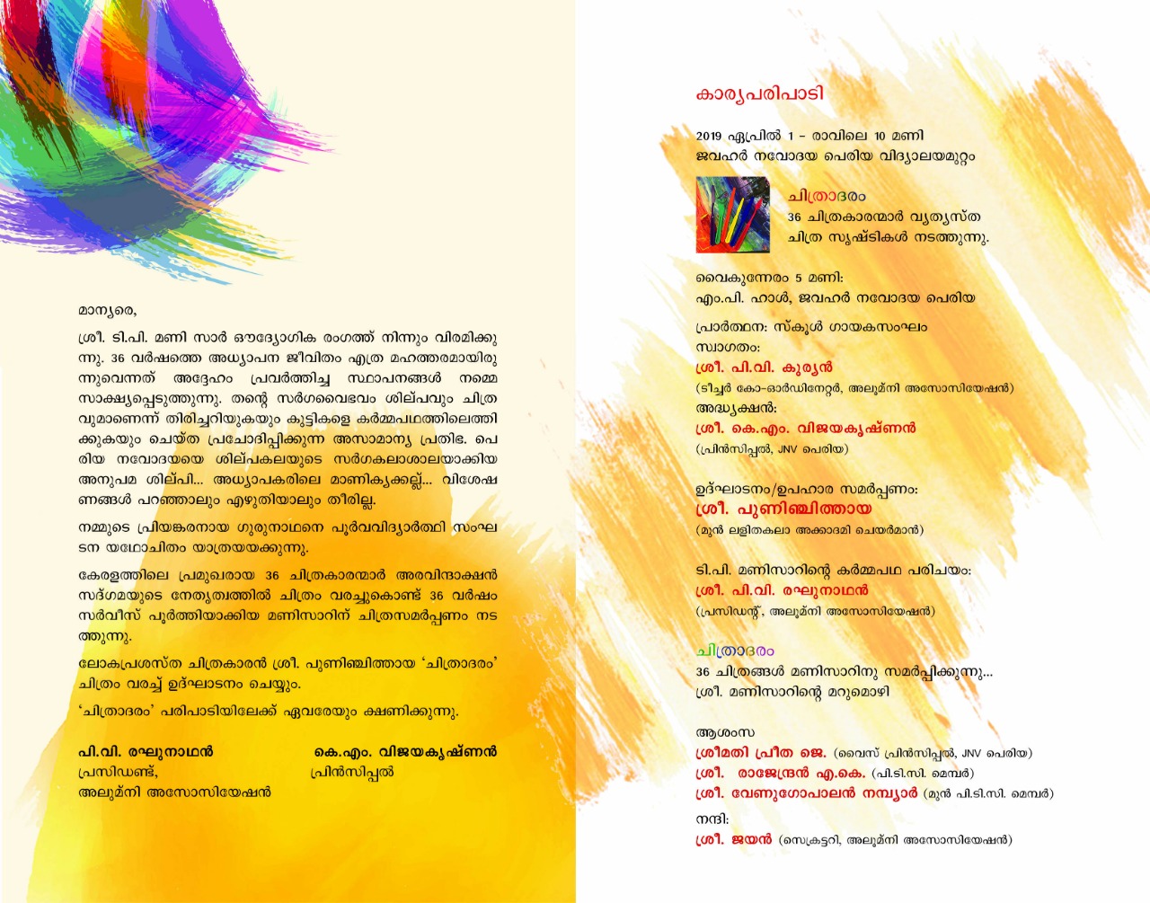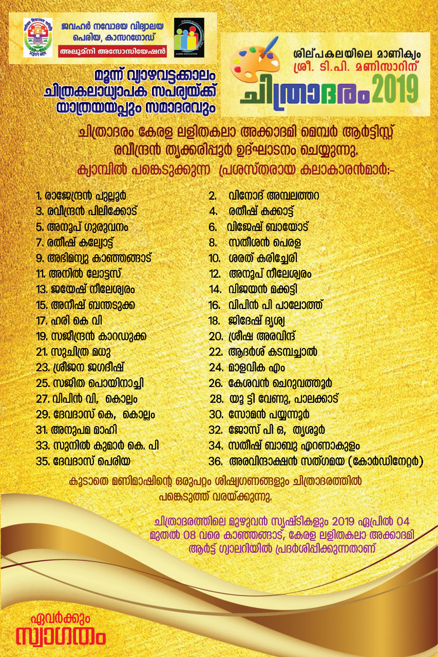 മൂന്ന് വ്യാഴവട്ടക്കാലം ചിത്ര കലാധ്യാപക സപര്യയ്ക്ക് യാത്രയയപ്പും സമാദരവും 2019 April 1st തിങ്കൾ രാവിലെ ജവഹർ നവോദയ വിദ്യാലയ ഓഡിറ്റോറിയത്തിൽ വെച്ച് നടത്തപ്പെടുന്നു
